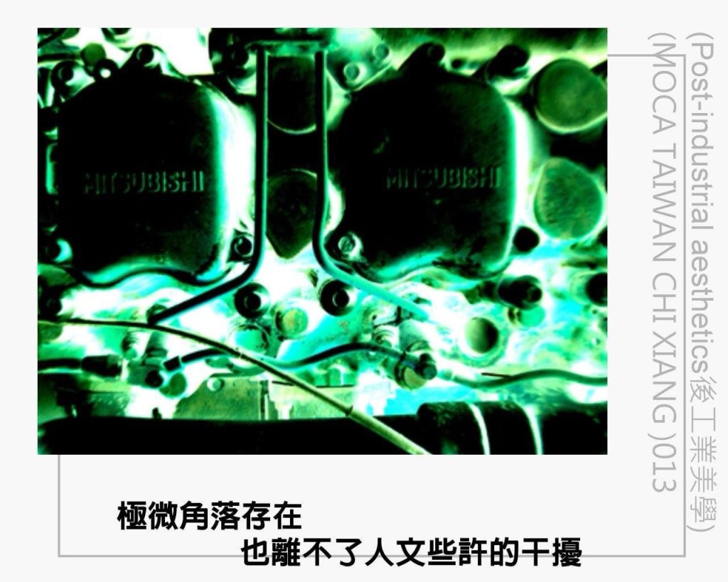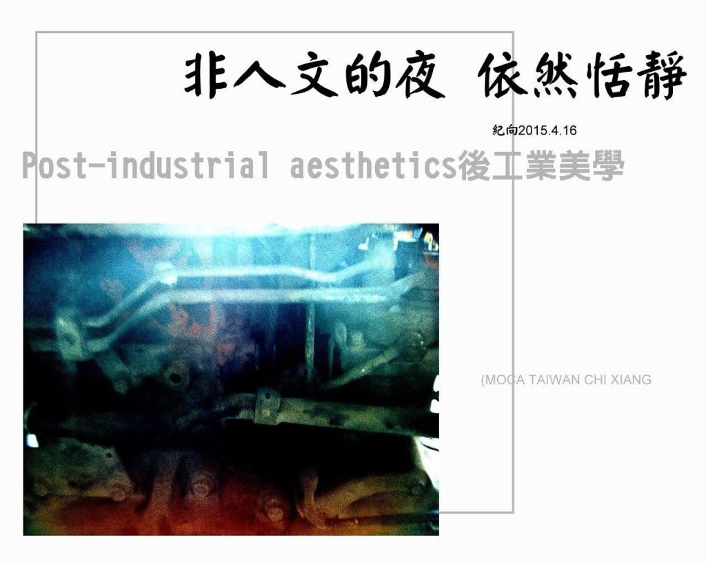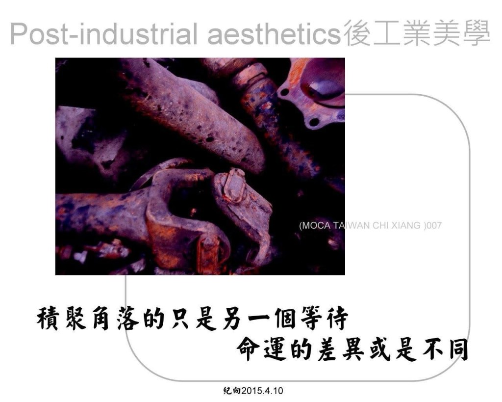 (後工業美學Post-industrial aesthetics)的探索,卻也難免以人的主觀,切入現象的存在美學。而此次探索的標的,即是以工業革命以來,衍生發生的工業現象後的後工業現象,希望以人的觀點,理出一存在現象美學的現象面。