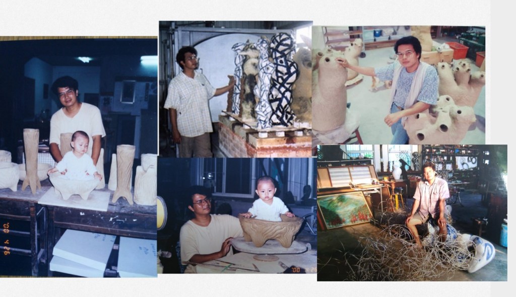 站在時代藝術的軌道,多少人憧憬了一個個藝術的夢,而在七零年代,尤其在台灣偏鄉的彰化鄉間,藝術還是一個渾然的夢,而書香門第的小孩鐘敏建卻負笈北上,進入藝術學習的大門,進而也接受了藝術的高等教育—藝術大學。當然了如此因為單純男孩,更也毫無阻擋接受學校給予一門門藝術課程,不管是古今中外,或是現代與古典無不涉足其間。當然了,在如此豐碩的藝術學習環境,一個年輕世代,不免也受了當時西潮影響,更也深受藝術家教授李德觀念的薰陶,也追求了當代現代藝術,但是期間如此一位莘莘學子,在其學習過程也情衷陶瓷媒材的創作。因緣際會受教於曾任職於台北故宮博物院研究古陶瓷研究的劉良佑教授,因此劉教授即是引領鐘敏建入門陶瓷藝術的導師。在此也不免在年輕意氣風發之際,創作了無數多媒材的繪畫與類裝置與鐵雕作品,確實也創作了無數歸屬現代藝術的創作。