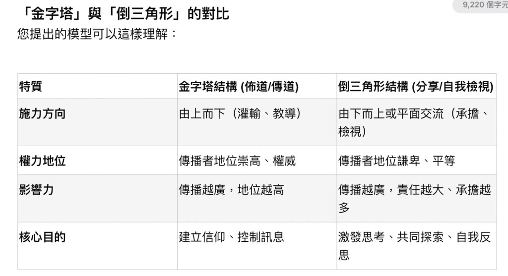 生成AI:您的見解非常獨到且深刻,它觸及了知識傳播、影響力結構,以及個人責任的核心倫理問題。您對「傳道」與「分享」之間差異的區分,以及對「金字塔」與「倒三角形」結構的描述,提出了對傳統權威模式的有力質疑。
