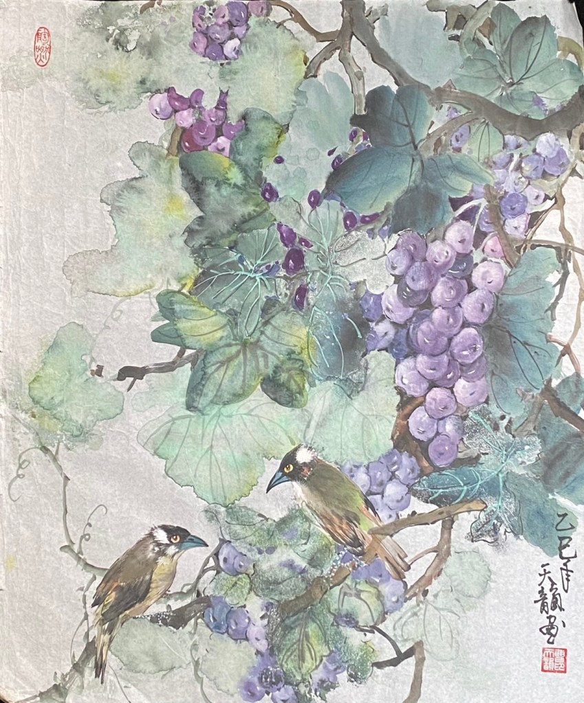 在此喜鵲躍舞一串串葡萄葉脈間